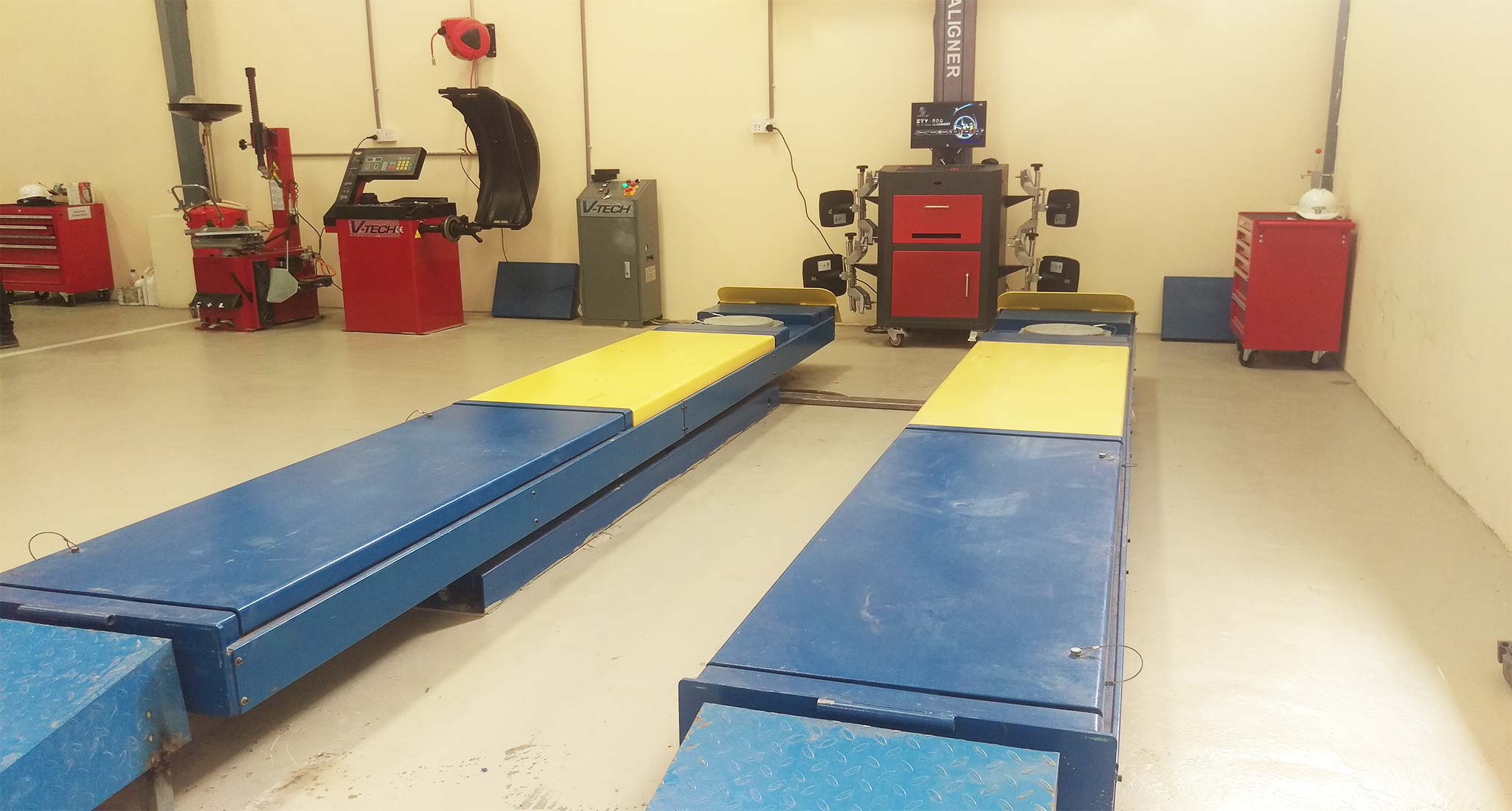 It is very essential that all the Wheels of a Vehicle are completely balanced otherwise there will be bubbling of wheel and this will affect the stearing control. Similarly, if the wheel alignment of a vehicle is out of order, the rubbing of tyres will be more and free movement of wheels also get affected. This results into rapid wear of tyre treads. To overcome these problems, computerised Wheel Balancing and Wheel Alignment machines are used. These machines are fully automatic, very accurate, quick and precise in their work.
